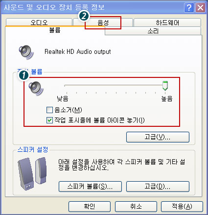 01.볼륨을 적절히 조절하시고 음소거를 해제해주세요. 02.음성 탭을 클릭해주세요. |