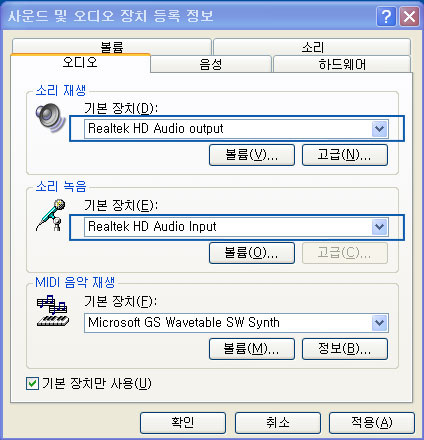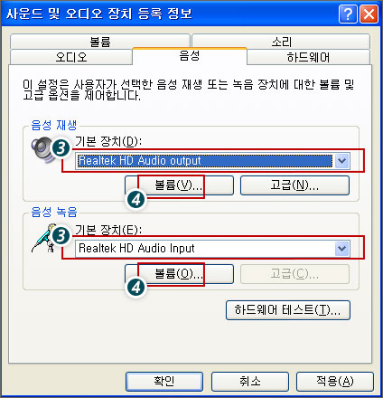 03.음성 재생과 음성 녹음의 기본 장치가 바르게 설정 되어있는지 확인해주세요. 04.음성 재생과 음성 녹음의 볼륨을 클릭하여 적절하게 조절해주세요. |