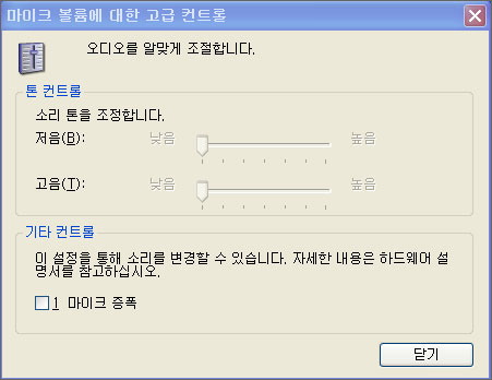 3) 음성 녹음의 마이크 볼륨에 있는 고급 버튼을 클릭하여 마이크 증폭을 해제해주세요. 녹음된 목소리를 재생 시 소리가 너무 작을 때 증폭을 사용하여 테스트 하시는 것이 좋습니다. |